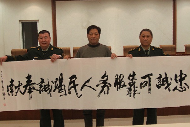 联合国世界和平教育奖章获得者、书画家冯锦屏(中)题写胡总书记勉励消防官兵“十二字”指示,左为政委安文强、右为副支队长赵宏利。