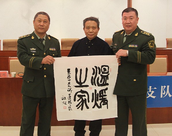 著名书法家、篆刻家、文化学者贾福林老师(中)创作草篆,并与政委安文强(右)、副支队长赵宏利(左)合影留念。