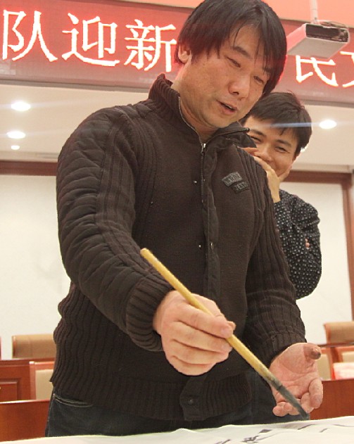 粉画泰斗李铁树教授在为官兵们书写春联