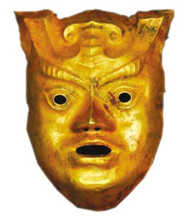 2009年4月8日,央视《国宝档案》节目专题介绍了这件国宝——战国黄金面具,在海内外引起很大震动。这个黄金面具现藏于河南省炎黄文化博物馆。它铸造于战国时期,按真人面貌特征锤揲而成,高31厘米,宽23厘米,呈椭圆形,双目圆睁,竖眉张口,眉骨突出,鼻梁高挺狭长,头顶戴角状头冠。容貌丰圆宽展,鼻梁通直,颧骨微突,它的眉、目、鼻、口比例匀称,刻画逼真,体现出了战国时期中原地区高超的金属铸造工艺。