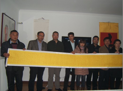 部分嘉宾在杨复新朱砂创作的《金刚经》前合影留念1