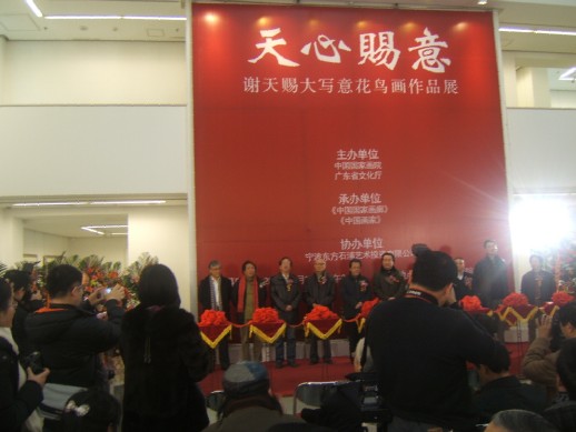 中国国家艺术网讯(钟文 报道):2013年1月27日,由中国国家画院、广东省文化厅主办,《中国国家画廊》、《中国画家》杂志承办的“天心赐意——谢天赐大写意花鸟画作品展”于下午2点在中国国家画院美术馆正式拉开帷幕。此次画展汇集了谢天赐先生近年新作100余幅,其中包括十几幅高2.5米,宽近5米的大画,全面展现了谢天赐在写意花鸟画继承、创新方面取得的突出成果。开幕式吸引了来自全国各地的各届名流及书画爱好者及百余家媒体近300人参加。