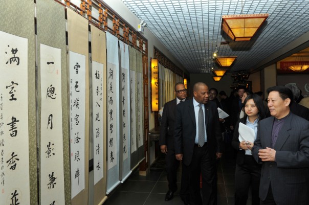 中华砚文化发展联合会会长刘红军中将(右)与中外嘉宾一同参观展览