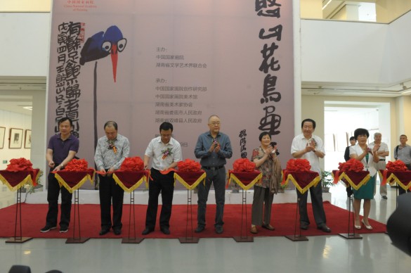 中国国家艺术网讯(钟文 报道):2013年5月25日上午10时,“王憨山花鸟画作品展”在中国国家画院美术馆举行开幕仪式。此次展览由中国国家画院与湖南省文学艺术界联合会主办,中国国家画院创研部、中国国家画院美术馆、湖南省美术家协会、娄底市政府、双峰县政府具体承办。中国国家画院院长杨晓阳,常务副院长卢禹舜,副院长张江舟、曾来德,创研部主任纪连彬,以及湖南省文联、美协,娄底市、双峰县有关领导和来自北京、湖南等地的著名学者、艺术家、新闻媒体等共200余人参加了开幕仪式。