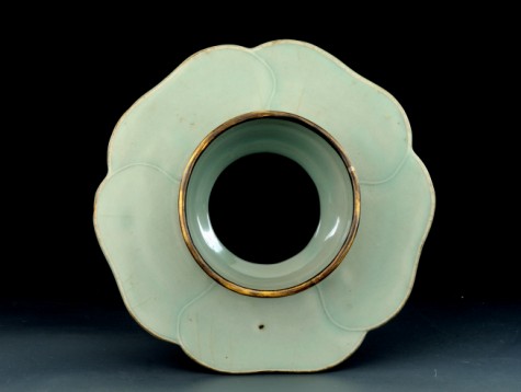 此盏托作五瓣葵花式,做工精细,直口微敛,镶有铜边,中空无底。葵花瓣式托盘平展微扬,托圈甚高,高圈足外撇,属北宋早中期典型器。全器施青釉,呈显淡碧色,俗称:“天青”,局部有少量开片,类似北宋官窑。圈足底端露胎,系采用垫烧,呈土黄色,局部露香灰色胎。明代鉴藏家曹昭在其撰写的《格古要论》中对汝窑有如下论述:“汁中棕眼隐若蟹爪者真”,又说:“无纹者尤好”。这件盏托开片很少,当属北宋汝官窑中的精品,极有可能是清宫旧藏,后流失到海外,历经沧桑流传到今天依然完好无损,甚为不易。