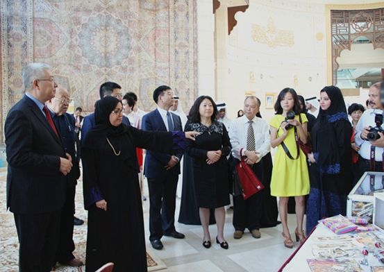 阿联酋社会事务部部长玛利亚·罗米向中国国际教育电视台台长李世强介绍阿联酋传统工艺项目(摄影:苏军)