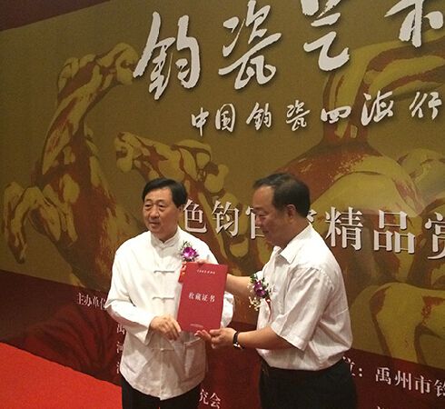 活动期间,河南钧瓷文化研究会向国家博物馆捐赠了12件钧瓷新工艺作品和一件由王忠全、司国顺先生设计、苗宗贤大师烧制的《国威尊》作品,中国国家博物馆馆长吕章申先生亲自向捐赠单位和个人颁发了《中国国家博物馆收藏证书》。