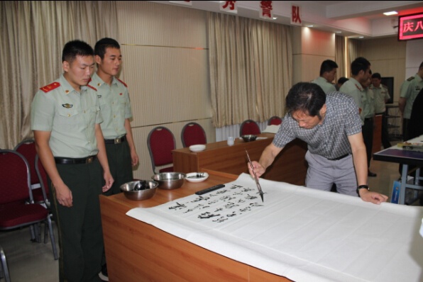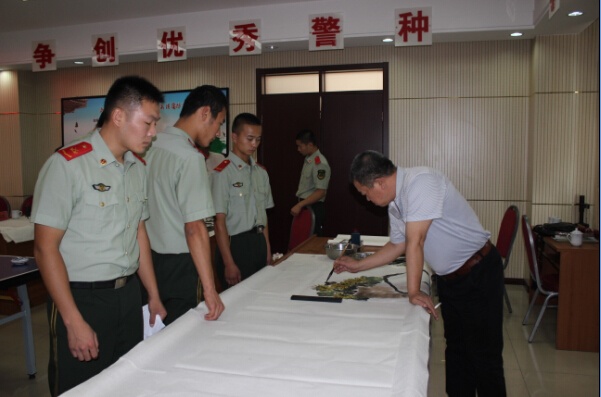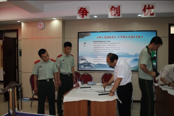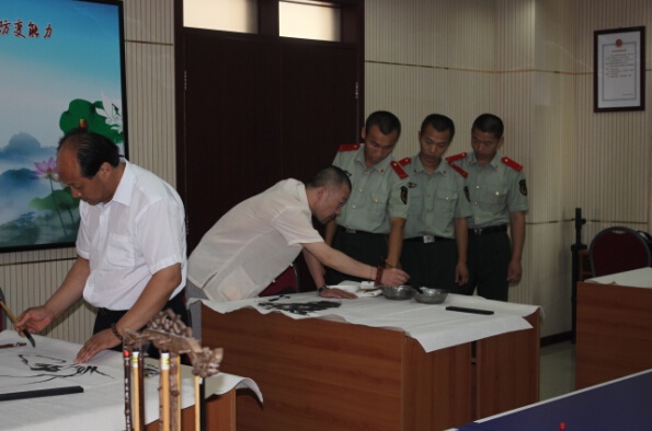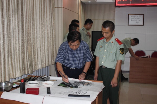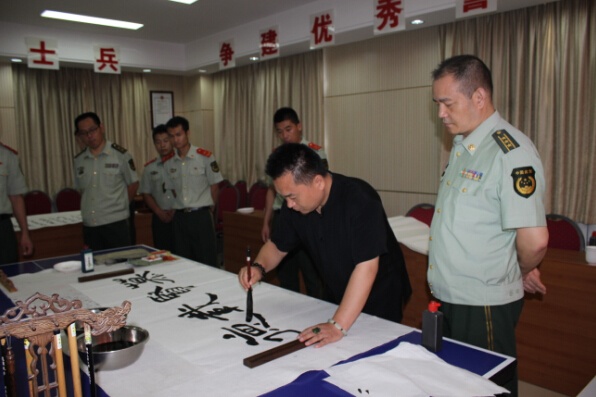 官兵为艺术家举行欢迎仪式(从左至右为:副支队长张丛德、中国国家艺术网总编辑钟文、著名画家冀培礼、支队长潘建军、著名书画家冯锦屏、政治处主任宋亚强)