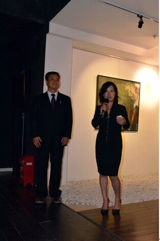 上海外滩帕奇艺术酒店董事长曾玲(右)为郑忠水墨作品展致辞,艺术家郑忠老师(左)