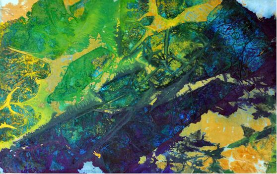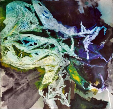 曾以版画家成名的郑忠最近推出了他的系列抽象水墨作品,包括《谷音系列》(2008-2012)、《碣石篇》(2013)、《极地系列》(2014)、《异境系列》(2014)等。都让人眼前一亮,拍案叫好。郑忠对于拓印技术的控制力和泼墨技法的领悟力,在作品中集中爆发出来。在大效果上,作品采用泼墨控制画面的结构和层次,笔势豪放墨色淋漓自不必说,更因隐弃了具象的轮廓而润泽了气韵的流转。加之作者擅长的拓印手法,将自然空间的质感层层渗透到纸面,形成新颖别致的抽象视觉体系,颇有“独得玄门”之感。画面不是简单的一气呵成,而是浑然天成与精心控制两种力量之间的微妙博弈,如太极推手般在画面上包裹了隐隐可见的生动气息,再加之分寸有度的色彩,让整个画面鲜活起来。整体布局也深得传统水墨之精髓:“古人用笔,极塞实处,愈见虚灵。”“虚处实则通体皆灵,愈多而愈不厌,玩此可想昔人惨淡经营之妙。”