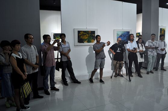 他早期的抽象水墨是比较多变的水与墨的交融,给人以丰富清新的意蕴。而这次专门为这次个展所做的正在展出的<异境系列>作品色彩的瑰丽,恢宏,张力令人心驰神往,情不能已,画面有一种雄强与自然的生机,空间意识也变得深邃,墨色在复杂的层次变幻中,给人以无限遐想。