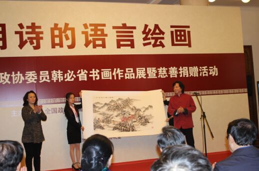 中国国家艺术网讯(钟文 报道):10月26日下午,“用诗的语言绘画——全国政协委员韩必省书画作品展”在全国政协礼堂隆重开幕。此次展览由全国政协书画室、民革中央画院和人民政协报社共同举办。开幕式上,韩必省向中慈国际交流中心和中国下一代教育基金会捐赠了绘画作品。