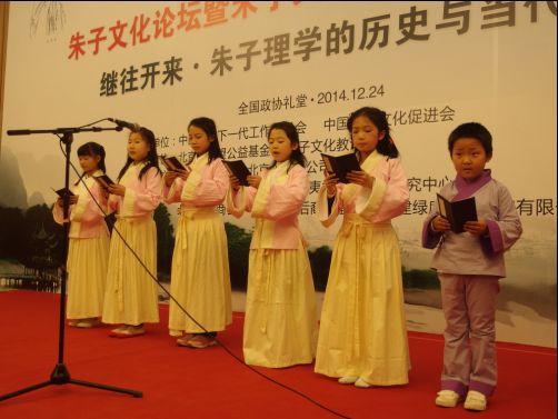 来自北京东漓吟社6个年龄在11—12岁的小朋友领读,集体朗诵《朱子家训》,40集《朱熹》电视连续剧作者汤建元即兴朗读诗歌《我与朱子对话》。论坛内容精致,会场气氛浓烈。既生动活泼,又有实际效果的内容。一系列的文化亮点,使本次论坛新颖独特,别具一格。