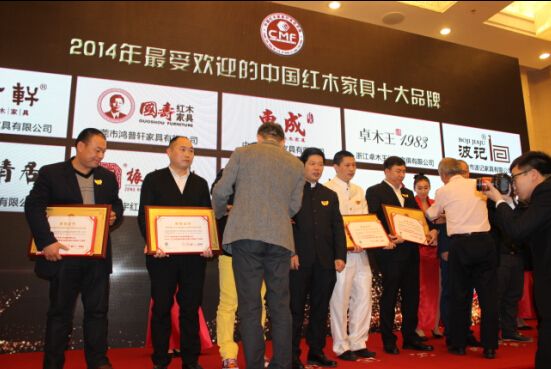 在品牌类奖项中,“2014年最具影响力的中国红木家具十大品牌”花落浙江年年红、东阳中信、中山区氏臻品、广州永华、东阳新明、中山鸿发、福建大家之家、东莞戴为、深圳泰和园、上海老周十家品牌企业;中山红古轩、东莞国寿、中山东成、东阳卓木王、中山波记、东阳明清居、东阳振宇、中山志成、东阳万家宜、东阳双洋摘得“2014年最受欢迎的中国红木家具十大品牌”;深圳万盛宇、中山忆古轩、中山名典、东阳苏阳红、中山雅仕轩、东阳国祥、东阳兴成、东阳御乾堂、中山唐明居、中山伟明轩十家实力企业则将“2014年最具创新力的中国红木家具十大品牌”捧到手。