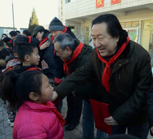 虽然寒风凛冽,但抵挡不住爱心传递的温暖。中国国家画院的画家们把装有助学金的信封交到孩子们手上,杨加砭小学的孩子们为画家们佩戴红领巾作为感谢,现场一片火红。中国国家画院与延安百名儿童的“手拉手”帮扶助学活动结缘于2012年,百名画家深入延安采风时,发现很多留守老人照顾着留守儿童,生活比较困难,在场的老中青三代艺术家一致认为应该为老区的人民和孩子做一点贡献,这样的爱心传递已经持续了3年。杨晓阳院长在致辞中表示,作为文化部直属的公益型事业单位,公益性是国家画院一贯坚持的宗旨。中国国家画院在致力于创作研究的同时,也高度重视社会公益事业的建设和发展,组织过抗击“非典”、援助汶川地震重建、全力支援西南抗击干旱、为革命老区送温暖等一些列活动。三年来,中国国家画院始终关注着延安的留守儿童,此次组织艺术家在节日来临之际再次来到延安,希望能为孩子们尽绵薄之力,同时也要在公益事业中起到带头作用。仪式结束后,艺术家们参观了留守儿童之家——葵园。据甘泉县委书记介绍,甘泉县共有留守儿童408名,杨加砭小学是较为集中的学校。杨院长仔细询问了葵园里孩子们的情况及硬件设施,看到墙上贴出的心理辅导活动照片时,杨院长嘱咐要多注重留守儿童的心理健康成长,并联合所有到场艺术家为学校题字。