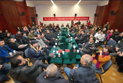 习近平总书记在文艺座谈会上强调,人民是文艺创作的源头活水,一旦离开人民,文艺就会变成无根的浮萍、无病的呻吟、无魂的躯壳。正是出于对习近平总书记在文艺工作座谈会重要讲话精神的深入领会,2月3日下午2点,艺术家们到达延安后直接抵达延安革命纪念馆,举行了“深入生活、扎根人民”中国国家画院与陕西省国画院、延安美协主题座谈会。会议由中国国家画院常务副院长卢禹舜主持,中国国家画院院长杨晓阳、副院长赵卫,中国国家画院研究员于志学、赵华胜、谢志高、方骏、尼玛泽仁,中国国家画院创研部主任纪连彬,国画院副院长梁占岩,青年画院副院长于文江,艺术信息中心主任王平,办公室主任吴一娜、副主任乔宜男,中国美协办公室主任刘建及研究员王孟奇、赵奇、吴迅、李庚、史国良、王永亮、李晓柱、李晓军,书法篆刻院篆刻研究所副所长魏广君等与延安市副市长郝宝仓、延安市原人大主任郝飚、陕西日报文艺部主任张立、陕西国画院院长范华、副院长王志平,延安革命纪念馆馆长张建儒,延安文联副主席、延安市美协主席李师明以及来自延安市文学艺术界联合会、延安市美术家协会、延安大学鲁迅艺术学院、延安国画院、延安民革画院、延安当代美术馆、延安嘉岭书院的文艺界代表共同交流座谈,围绕“深、扎”主题进行探讨。