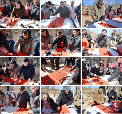 2月4日下午,画院艺术家一行又来到甘泉县石门乡晋塔村,为当地村民送去新春对联。当艺术家们把一幅幅充满情谊的春联送到村民手上,黄土搭建的小院子里立刻充满了年味。火红的春联在蓝天、黄土的映衬下愈发显得热烈温暖,村民们的笑容更是让人动容。被现场的气氛感染,艺术家们就以院子里的小车为案,挥毫泼墨。雪后的山区气温极低,很多艺术家的手都冻僵了,于志学、赵华胜、谢志高等几位老艺术家虽然高龄但依然充满热情,写对联的纸打开了一包又一包;杨院长在写完春联后又应村民们的要求题写镇名;纪连彬、王孟奇、刘建、李晓军、王平、于文江、梁占岩、吴迅等老师一边写一边交流:“这几个字写得好!”魏广君老师在身体不适的情况下仍然写到最后;何加林老师已经写了四五十幅了,还在问在场的老乡:“谁还没有?”他说,看到这种情景他很受感动,写春联的过程自己也感受到一种艺术抒发的激情,看到老乡们脸上的笑容就觉得写得不够,还想再写几幅。很多画家都有同感,尼玛泽仁老师说:“国家画院在开年之前用行动来落实习总书记的讲话,到生活中来,到人民中去,把文化送人民,用文化惠人民。写几个字微不足道,但看到我们的文化确确实实给人民带来了快乐,这就是我们的责任”。红彤彤的春联在金黄色的窑洞里流动,笔墨在画家们的手中传情。村委会村支书袁治东告诉记者:“村庄的人口稀少,平日里村里十分宁静,画家们的到来,为村庄增添了生机,我们很激动,也很开心,感谢他们来到这里,让这里有了年味,希望他们以后常来!”