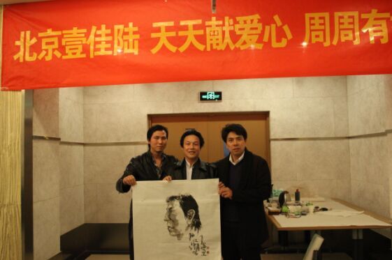 高贵强(中)现场为爱心人士陈廷锋(左)画肖像