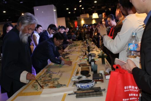 随后,艺术家公盘的八位艺术家现场联合重作中国十大传世名画之一、北宋王希孟的《千里江山图卷》,以现代艺术语言和个性风格重新演绎了传统经典,寓意艺术家公盘的愿景和使命:一方面发掘中国当代优秀艺术家,推广中国当代思想价值,为世界当代文明提供中国的文化价值;另一方面以当代智慧和资源“联手打造、传承文化,再开新天”。
