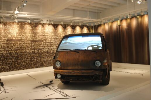 金炳昊用这辆1993年的现代Galloper创造了一座巨型纪念碑,摄影师车主在20年中开着这辆车走过山路,走过泥泞。作品通过雕塑与装置,将八扇窗固定在钢筋混凝土的结构中,一如面向世界的取景框,凸显了个体的视觉与可感知的世界,将观者导向一段共享的回忆。