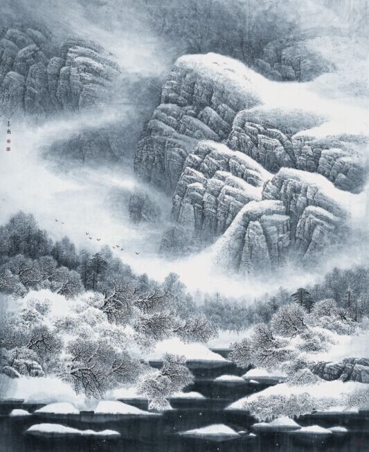 赵金鹤自上世纪80年代初涉猎山水画以来,走的是一条“师古人,师今人,师造化”之路。在进入鲁迅美术学院山水研修班学习时,为他打下了坚实的传统山水画基础。赵金鹤是贴近大地、贴近生活的现实主义北派山水画家,生于山海关外的他绘画题材大多取材于关东的燕山山脉,在这片朴拙而神奇的土地上留下了他长年写生的身影。他追随北派山水范宽之笔法,并以“我自有我,自有我在”的信念塑造出自己的艺术个性,形成了他扎实、稳健的画风,也使北派山水的笔墨语言在新的语境下焕发出新的魅力。在他的山水画中,以细勾、细皴、细染、细点为主要画法,或浓或淡、或燥或润、或错或落、或疏或密、或聚或散,把精微画得坚实,把密集画得空灵。他的每幅画中所必需的元素都是齐备的,有线有面、有点有皴、有擦有染、有大有小、有虚有实,尤其是将西法的光影明暗融入到他的笔墨之中而创造的“反衬法”,使作品画面密而不塞、繁而不杂、层次有序,直呈大自然本原的世界。