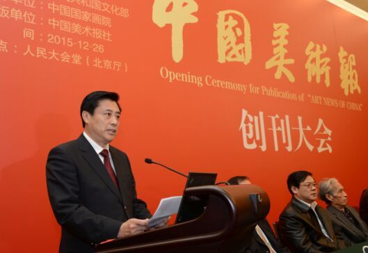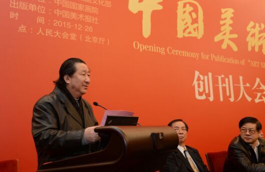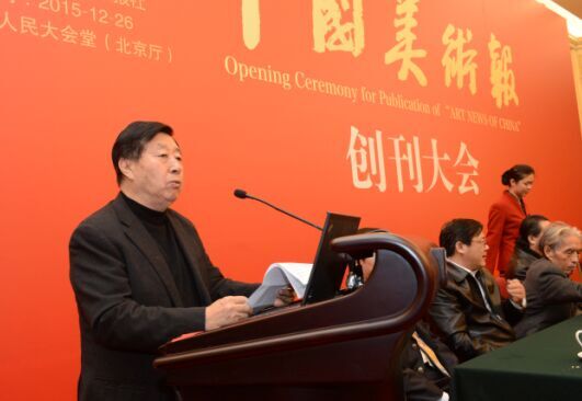 中国国家艺术网讯(钟文 报道):2015年12月26日,《中国美术报》创刊大会在人民大会堂隆重举行。国家艺术基金会理事长蔡武,文化部副部长董伟,中国文联副主席、中国美术家协会主席刘大为,中国国家画院院长、中国美术家协会副主席杨晓阳,中国国家画院名誉院长刘勃舒,文化部艺术司司长诸迪,中国美术馆馆长吴为山,中国美术家协会党组副书记徐里,法兰西美术家协会主席雷米·艾融,中央机构编制委员会办公室原副主任王澜明,中华两岸艺术基金会会长庄汉生,文化部办公厅副主任张维国,国家艺术基金管理中心主任韩子勇,文化部外联局副局长陈发奋,中国艺术科技所所长王丰,中国文化传媒集团董事长刘承萱,中国美术馆党委书记游庆桥,东方演艺集团董事长宋官林,恭王府管理中心主任孙旭光,中国舞蹈家协会分党组书记兼驻会副主席罗斌,中国国家画院常务副院长卢禹舜,中国国家画院副院长张江舟,中国国家画院副院长曾来德,同曦集团总裁陈广川,华辰拍卖总经理甘学军以及文化部部分司局、中国文联、新闻出版广电总局、中国美术家协会、中央美术学院、中国美术学院、驻京新闻媒体、艺术家代表及企业界人士共200余人出席了此次大会。大会由中国国家画院副院长张晓凌主持。