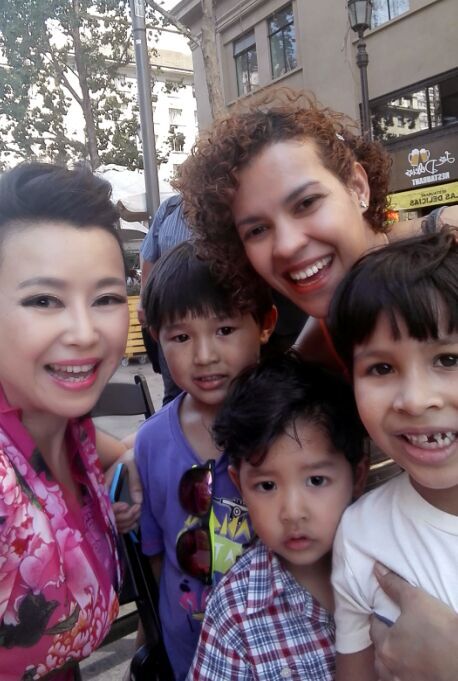 姚林辉在智利总统府前与当地儿童在一起