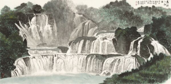 本次展览作品呈现的新面貌,是魏镇外出旅游写生时从大自然鬼斧神工般的神奇造化中所感悟到的,同时也是因现代人审美观的变化而应运而生的,既写实又写意;既有传统的中国山水画的骨法和晕染,又有西方绘画的色彩及光晕,令观赏者有耳目一新之感。画家新画的太行山,以及在欧洲、美国等地的写生画都是如此,与此前的画有了不小的变化,体现了画家对自己画风的突破。《飞流下急湍》描绘了德天瀑布的恢宏气势,丰富的层次感表现了层层叠叠的大小瀑布,水流水势水气水音无不表现得漓淋尽致。《春之韵》中,传统的金线勾描画法和大面积石青色块的运用,充分体现了晨晖光线折射下蓝色梯田的层次感,头青、二青、三青的精细使用体现出色彩的极致变化,视觉效果强烈。