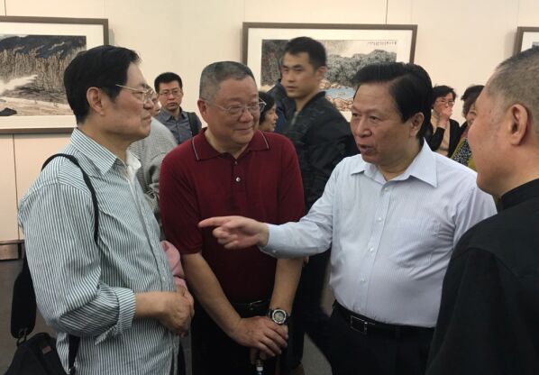 全国政协常委、原江苏省委书记梁保华(右二)在展览现场与魏镇(左二)亲切交流