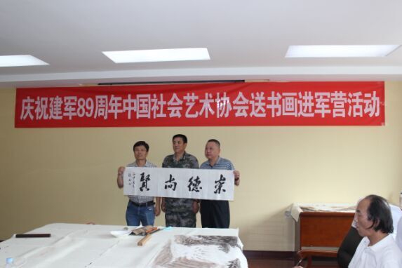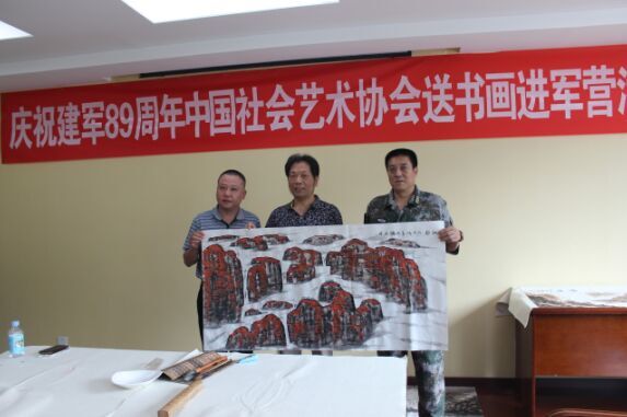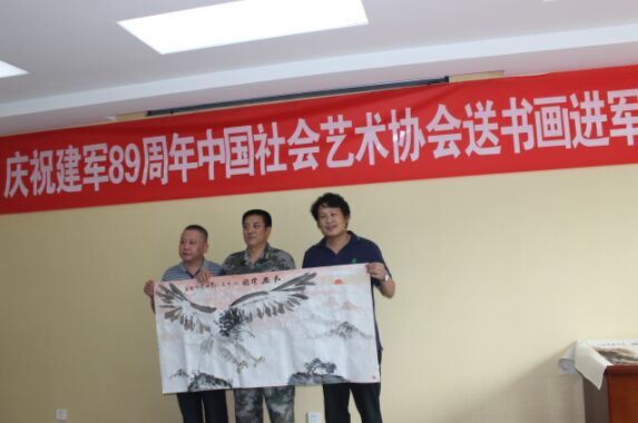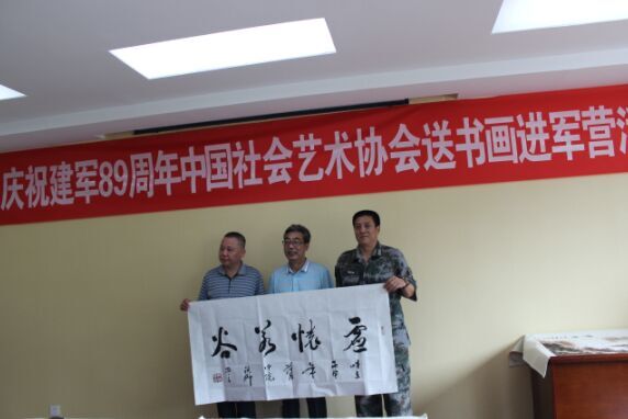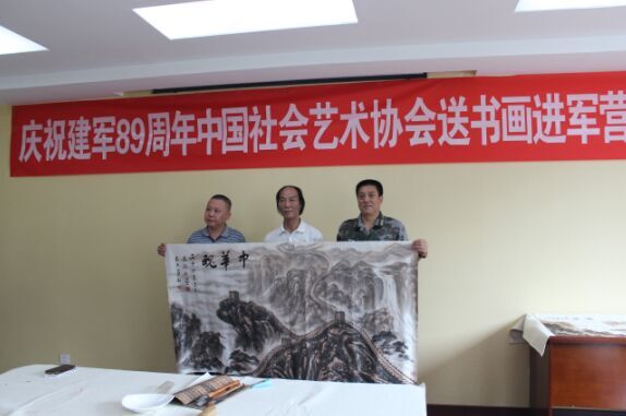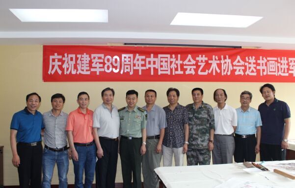 本网讯:2016年8月2日上午,由中国社会艺术协会组织的“庆祝中国人民解放军建军89周年书画名家进军营”活动在廊坊军分区举行。著名书画家冯锦屏、钟文、郑国峰、高祯卿、戴玉春、蒋志强等出席了慰问活动。廊坊军分区司令员焦加根代表部队对艺术家深入军营表示热烈欢迎。