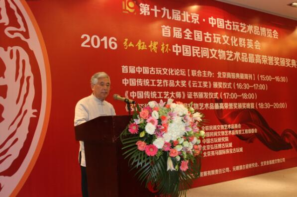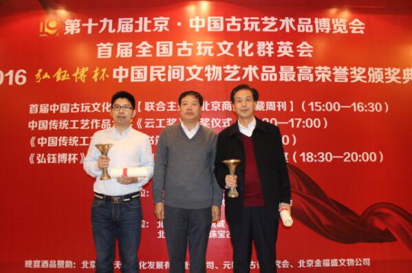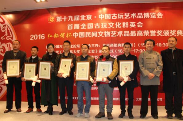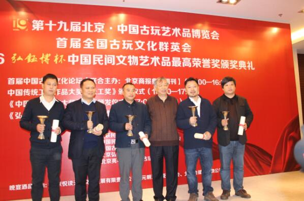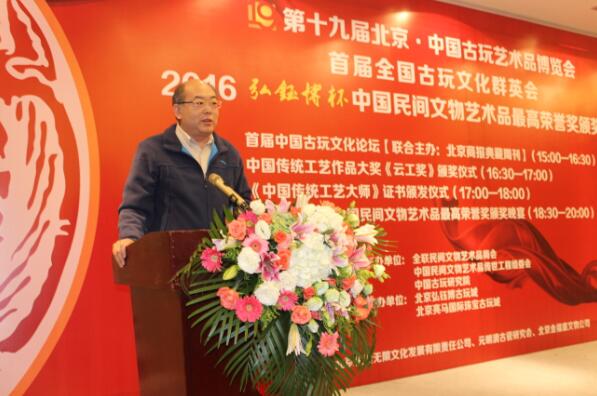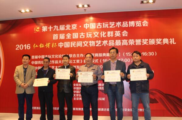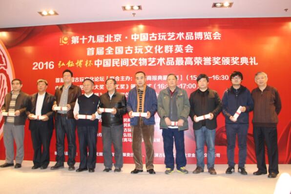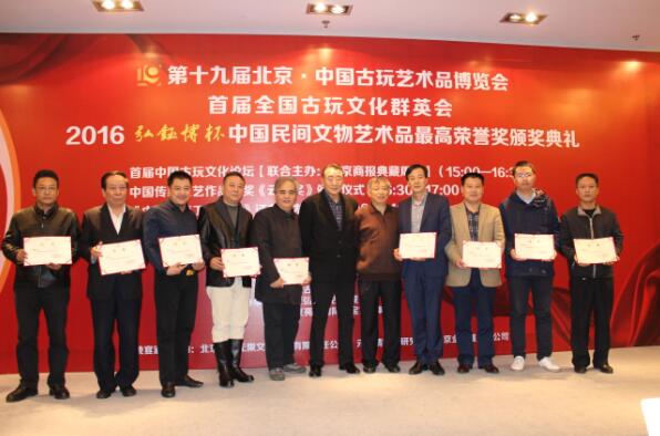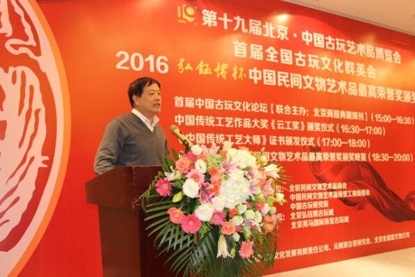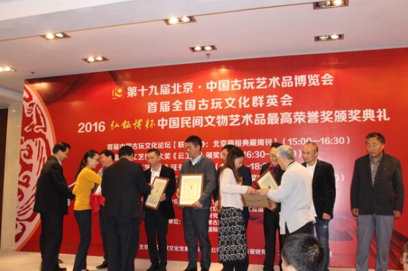 此外,首届全国古玩文化群英会暨首届古玩文化论坛,是第十九届北京中国古玩艺术品博览会的重要活动之一,博览会颁奖典礼随后举行。中华文化交流与合作促进会理事长、全国工商联原常务副主席孙安民、全国工商联原副主席宋北杉、北京弘钰博古玩城董事长兼总经理张树科以及古玩界知名人士、全联民间文物艺术品商会副会长、中国古玩研究院副院长出席并颁奖。