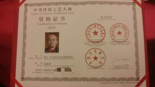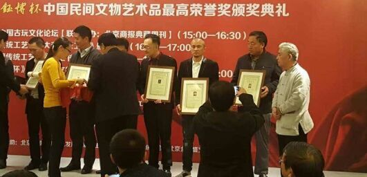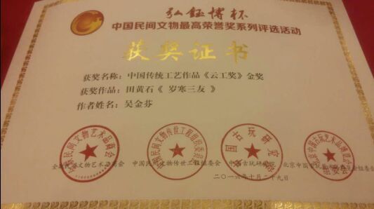 2016年10月,田黄石《岁寒三友》荣获中国传统工艺云工奖金奖,并被授予“中国传统工艺大师”资格。