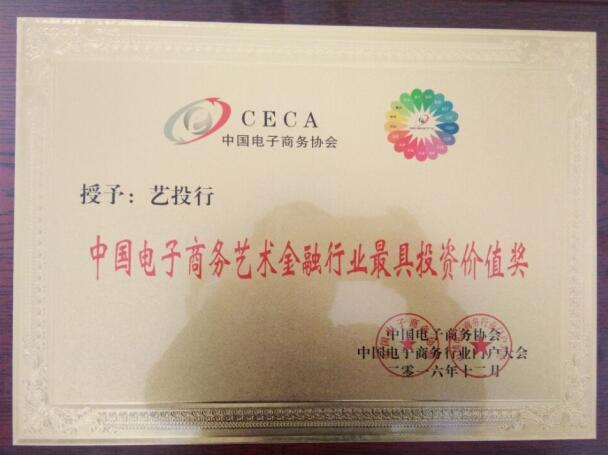 本次大会面向全国互联网媒体甄选,对2015-2016年度在电子商务互联网构建领域有突出成绩的媒体和公司进行了表彰,“中国电子商务艺术金融行业最具投资价值奖”颁发给了艺术品供给侧改革先行者、艺术金融典范企业艺投行。数百家参选机构通过推荐参评、网上投票、专家评审、媒体公示等一系列环节,艺投行最终斩获“中国电子商务艺术金融行业最具投资价值奖”。百度外卖、央视网商城、京东、乐视网、中国国家艺术网、妈妈网、秒拍、房天下、慧聪网等国内近百家知名互联网企业分享了其他各项大奖。
