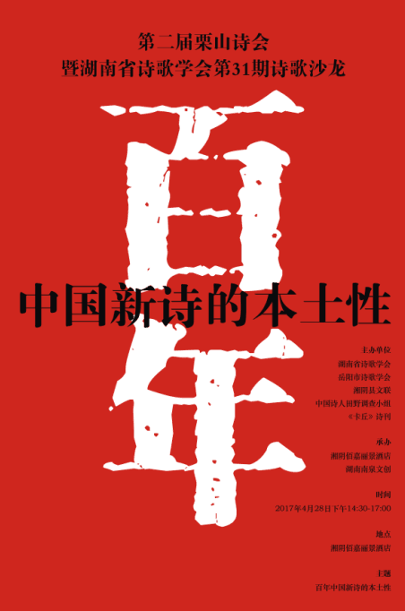 中国国家艺术网讯:2017年4月28日,第二届栗山诗会暨百年中国新诗的本土性研讨会在湖南湘阴召开。栗山是湘籍著名诗人、评论家周瑟瑟的胞衣地,自去年在栗山举行过周瑟瑟诗集《栗山》朗诵与座谈会后,决定每年春天举办一次栗山诗会。本次活动同时是湖南省诗歌学会第31期诗歌沙龙。参加诗会的诗人有周瑟瑟、梁尔源、罗鹿鸣、谭克修、路云、黄明祥、雷武铃、李不嫁、梦天岚、陈惠芳、肖歌、吴茂盛、赵海洋、汤红辉、周春泉、徐汉洲、幽林石子、杨自章、周伟文、马迟迟、何青峻、李冈、张灵均、叶菊如、朱开见,以及湖南省作协副主席、岳阳市作协主席、岳阳市委宣传部副部长彭东明、湖南理工学院文学院院长、评论家杨厚均、湘阴县副县长汤静、湘阴县政协副主席、县文联主席熊国庭,湖南本地文艺界代表、朗诵艺术家50多人。活动由湖南省诗歌学会、岳阳市诗歌学会、湘阴县文联、中国诗人田野调查小组、《卡丘》诗刊主办,由湘阴佰嘉丽景酒店、湖南南泉文创公司承办。