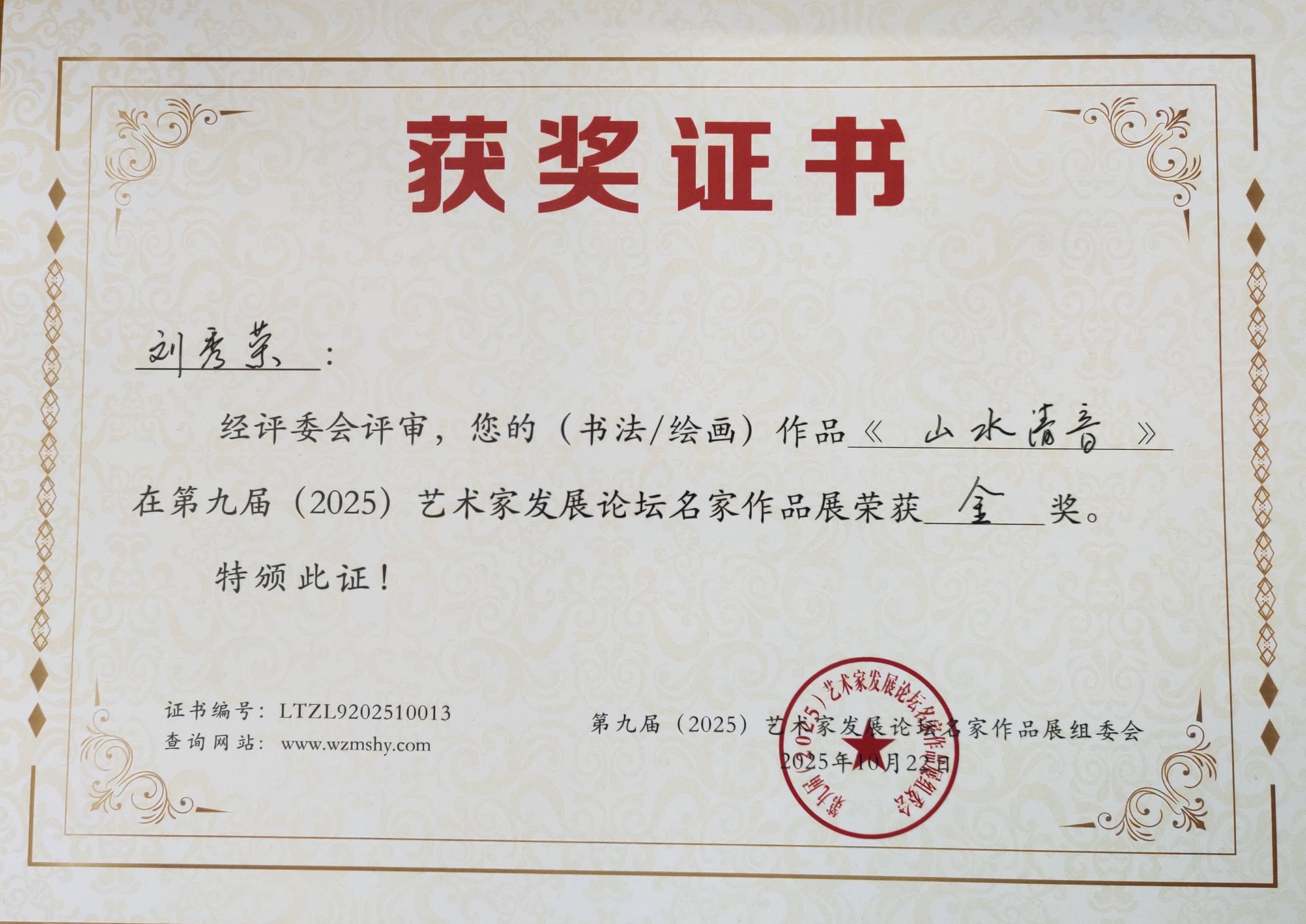 2025年10月22日,第九届艺术家发展论坛暨名家作品展在张家界隆重举行。著名书画家刘秀荣作品《山水清音》荣获金奖。