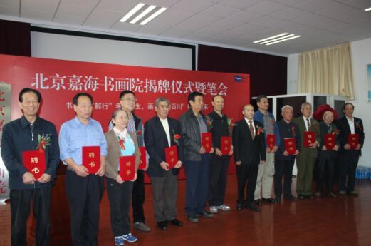 北京嘉海书画院名誉院长、北京嘉海文化传播有限公司董事长、资深图书出版人黄丰文先生给书画院部分荣誉顾问颁发聘书并合影留念